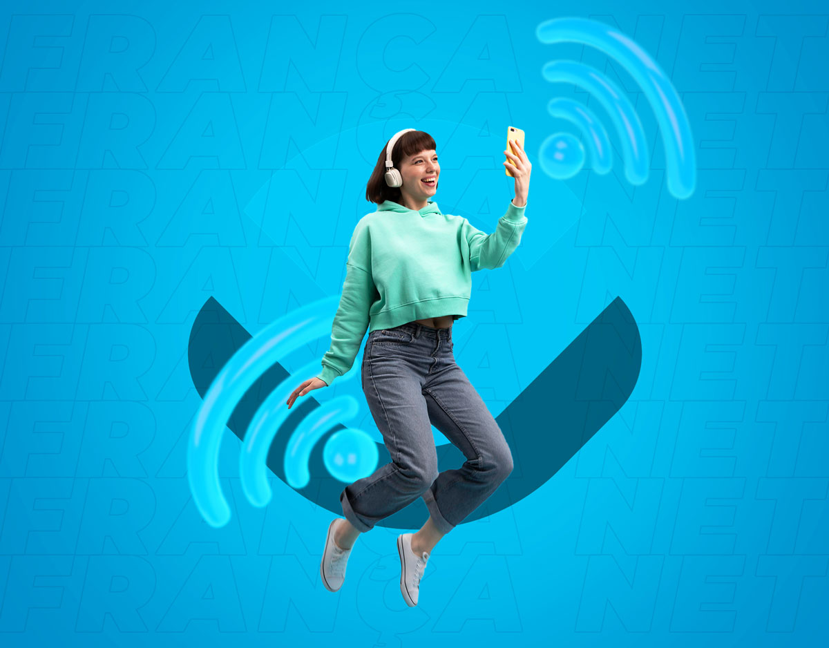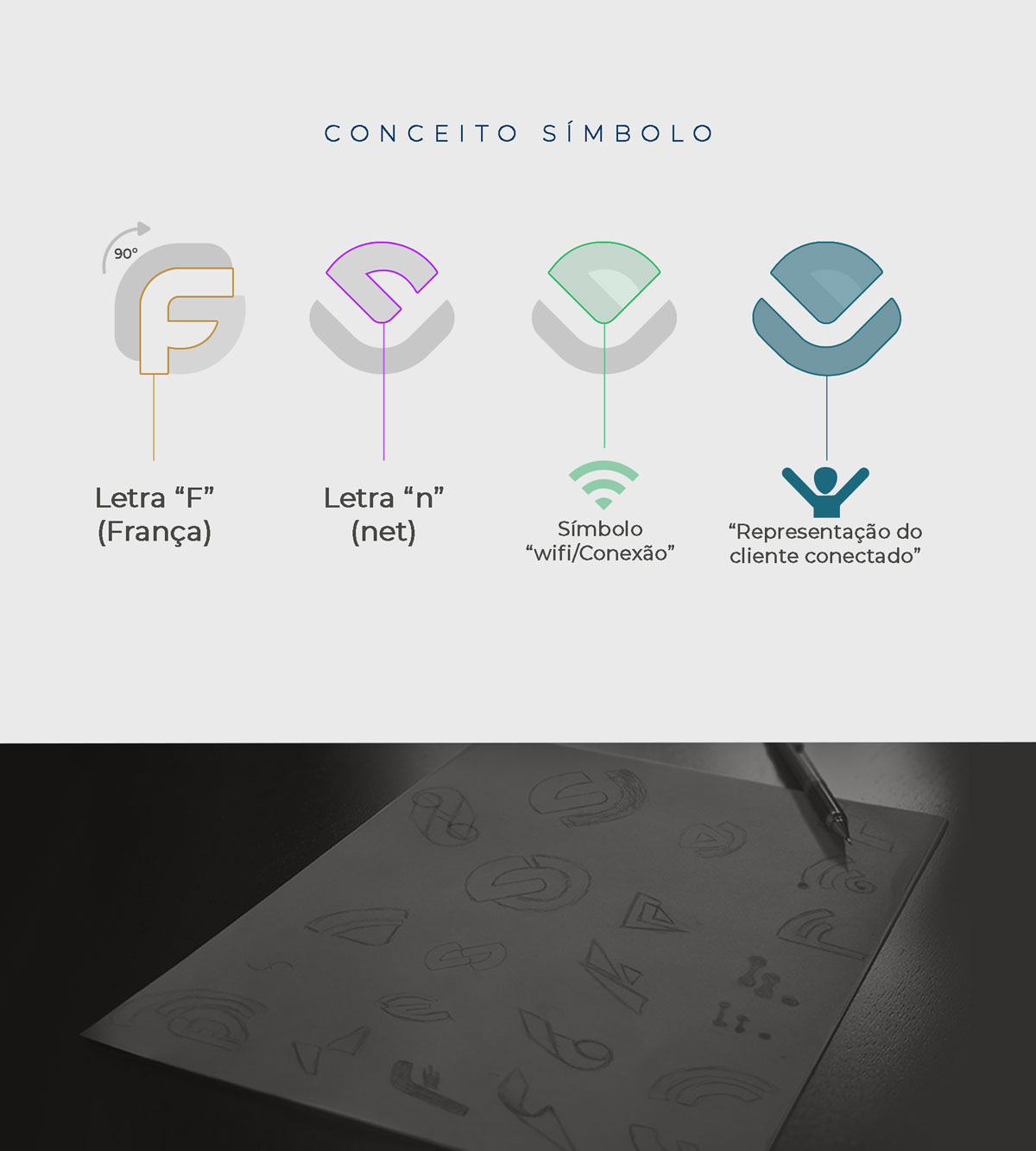 O 1º passo para a construção de uma marca é o planejamento. Para isso, buscamos realizar uma pesquisa de mercado, assim como uma definição dos valores da Françanet, e como o provedor quer se posicionar no mercado, para que assim a marca comunique exatamente isso, através da sua tipografia, paleta de cores e símbolo.