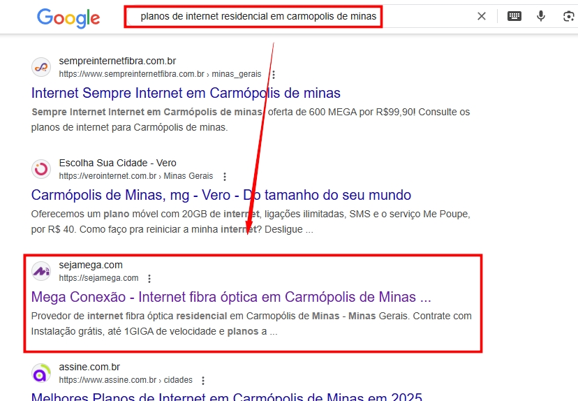 Quando alguém busca por “provedor de internet” na região, a Mega Conexão aparece. Com estratégias de SEO, conquistamos as primeiras posições do Google de forma orgânica, gerando leads gratuitos todos os dias.